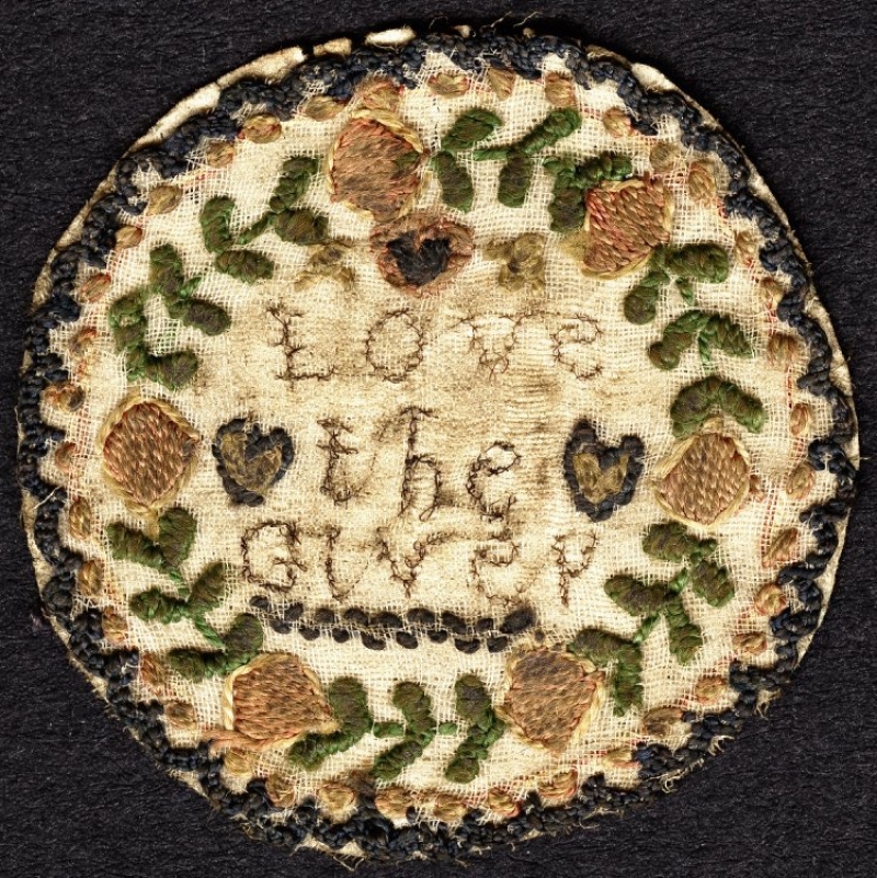 The British Museum, London, has a large collection of clocks, prints and related items, including over two thousand watch papers, of which twelve are embroidered. The collection original belonged to Courtenay Adrian Ilbert (1888-1956) and was acquired, via Gilbert H. Edgar, CBE, by the British Museum in 1958. The example shown here is made of linen with silk embroidery. It has the inscription “Love the Giver” worked inside a simple wreath of flowers and leaves. It is worked in buttonhole stitch, chain stitch and satin stitch. The cloth is about five cm in diameter and mounted on card. The embroidered centre was first worked, then the ground material was attached to the card. The next stage was to embroider the edge of the circle with buttonhole stitch, making sure the stitches went through both the ground material and the card.