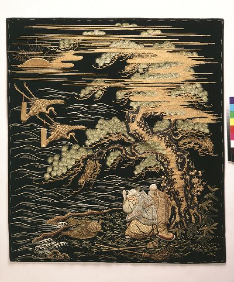 The embroidery depicts the legend of the elderly couple of Jo and Uba. After their death their spirits went to an old pine tree on the island where they used to live. They adopt a human form on moonlit nights.