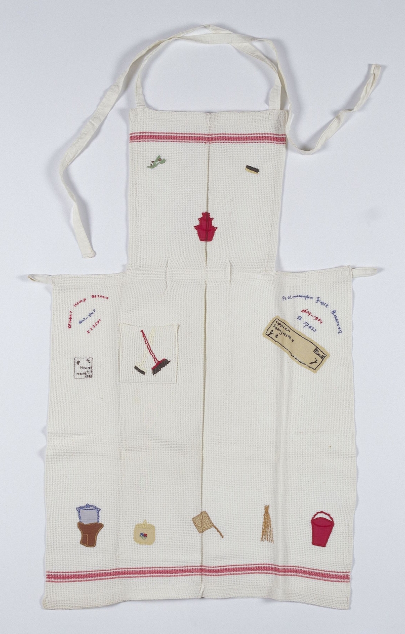 The apron was embroidered during the internment of Mrs Coppoolse in Indonesia during the period of Japanese occupation. Kramat camp was located at the modern Indonesian capital of Jakarta, formlery called Batavia. Mrs Coppoolse was aged 42 in 1945, and living in the camp, with camp number 22501, with one child.