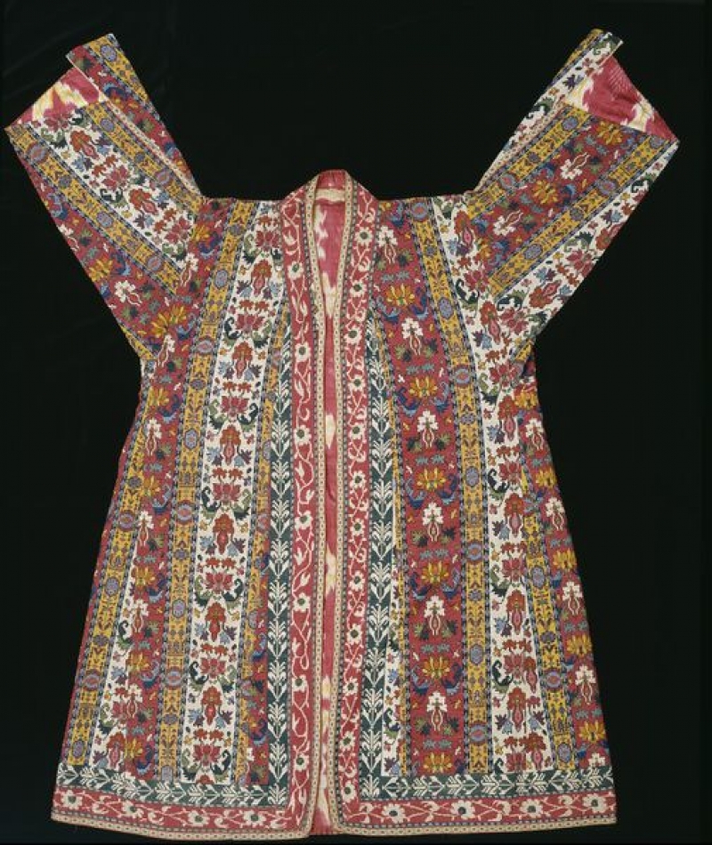 The coat is densely decorated with stripes with floral motifs densely embroidered in cross stitch. A band of green and white tablet-woven material has been sewn on, forming an edging.