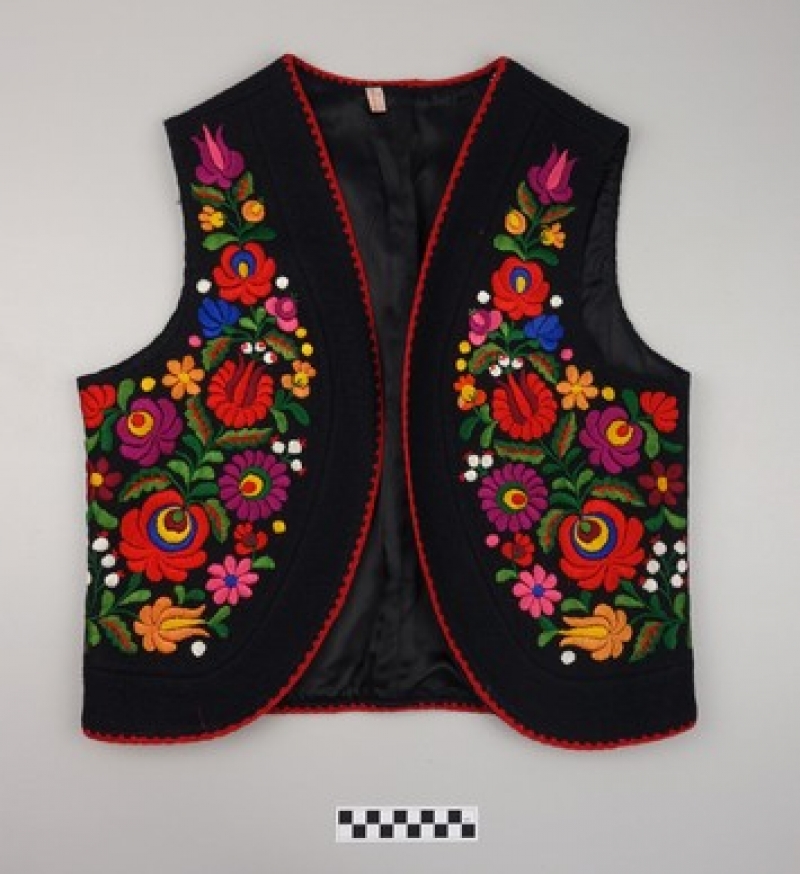 The Textile Research Centre (TRC), Leiden, houses a beautifully embroidered woman's waistcoat that derives from Hungary and dates to the late twentieth century. It measures 47 x 44 cm. It comes from the region of Matyo, and the decoration is characteristic for the area. The waistcoat is made of (factory made) black felt, decorated with rayon thread.