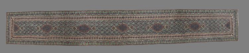 The cloth was acquired in the mid-nineteenth century by Major John Goodday Strutt Gilland (1791-1848), who served in Afghanistan during the First Anglo-Afghan War (1838-1842) and distinguished himself at the siege of Ghazni (Afghanistan) in the summer of 1839. The cloth reputedly was taken after the British had taken the Ghazni fortress and, again reputedly, had been worked for the Afghan leader, Dost Mohammed Khan, who was deposed by the British in 1839, but returned to Kabul after the British defeat and who would rule the country until 1863.