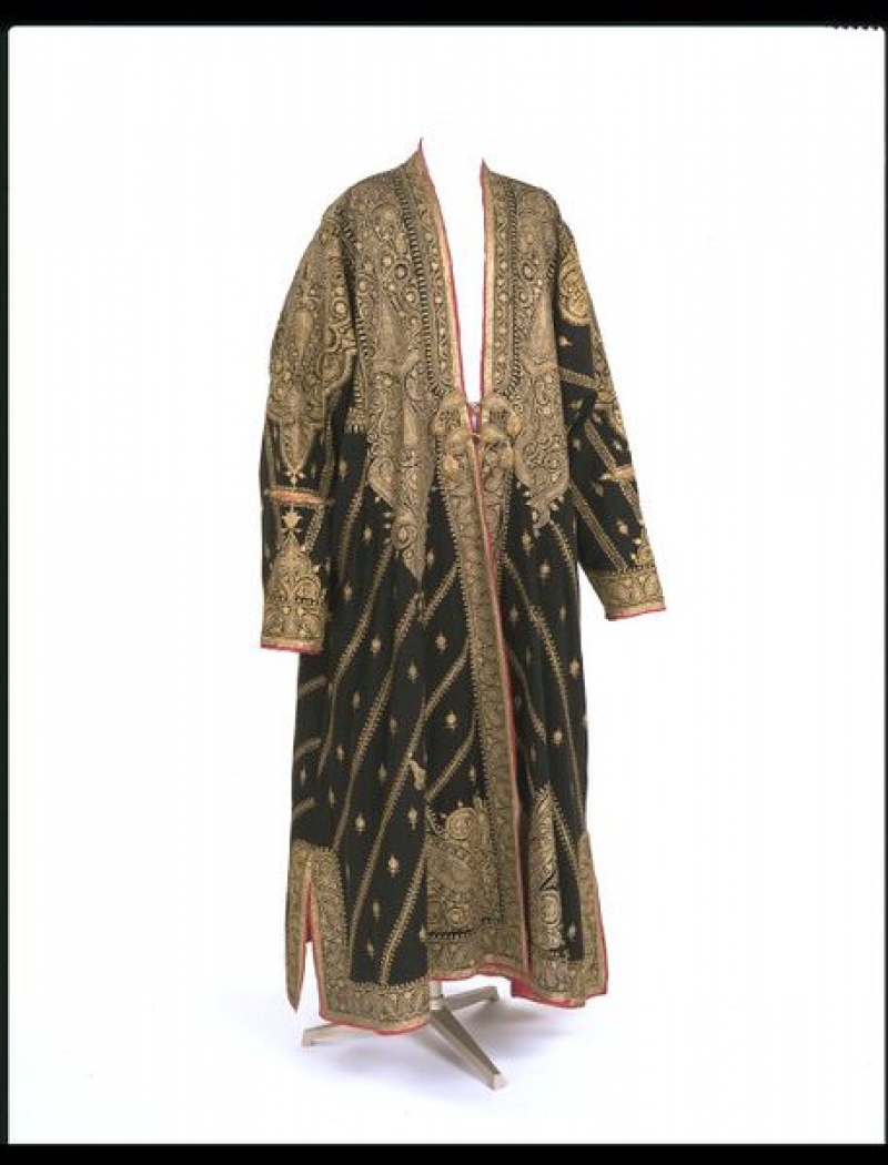 The Victoria and Albert Museum in London houses a nineteenth century Kashmir coat made of black wool with gold thread embroidery. The embroidery includes the paisley motif.