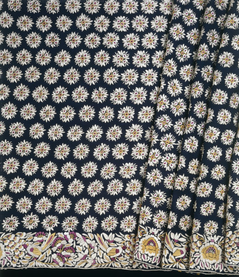 This sari, or at least the decorated fabric, was probably made in China in the first half of the twentieth century, especially for the Parsi community in India. The centre is covered with rows of rosettes, while the border shows Chinese-style designs of birds and flowers.