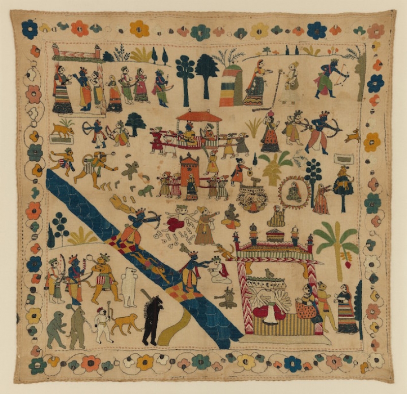 Most of the chamba rumals from northwestern India depict scenes from one of the avatars of the Hindu god, Vishnu, including that of Rama (as recounted in the Ramayana). This rumal shows Rama, his wife Sita, and his brother Lakshmana bidding farewell to Rama's mother before they go into exile in the forest. Next we see Ravana, being disguised as an ascetic, attempting to seduce Sita while Rama, her husband, is hunting a golden deer that was sent by Ravana as a diversion. Ravana takes Sita away and is shown being imprisoned in Ravana's palace. The next scene being depicted (lower left hand corner) shows Rama, Lakshmana, Hanuman, and the monkey and bear armies crossing over to Lanka (Sri Lanka/Ceylon) and move towards Ravana's fortress and defeat Ravana. In the middle of the embroidery, the final scene shows Rama, Sita, and Lakshmana departing in triumph, being carried in palanquins.