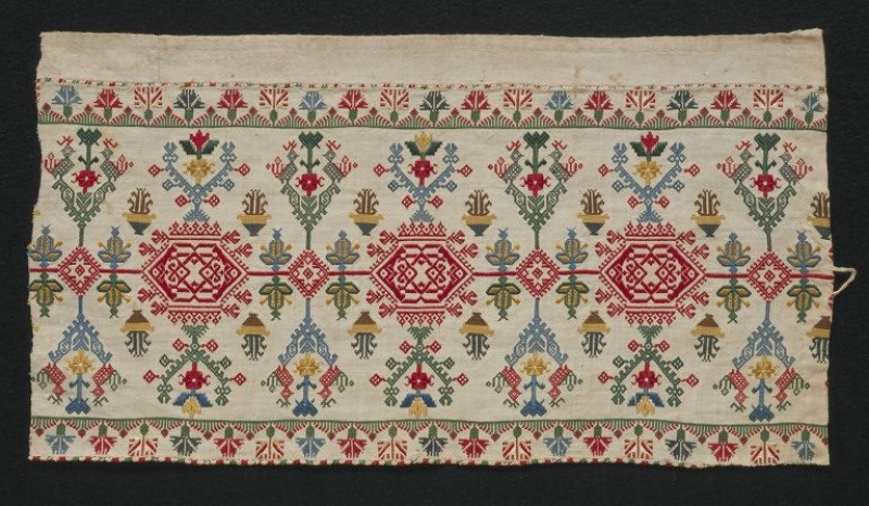 The piece was owned by the English designer and founder of the Arts and Crafts Movement, William Morris (1834-1896). The object was bequeathed to the Victoria and Albert Museum in 1939 by his daughter May Morris. According to the Museum records it was acquired by Morris at the same time as two pieces of Cretan embroidery that Morris in 1876 sent to the English textile manufacturer, Thomas Wardle (1831-1909), with the message: “Mrs Wardle will find some stitches in them worth looking at.” Wardle’s wife was a well-known embroideress.