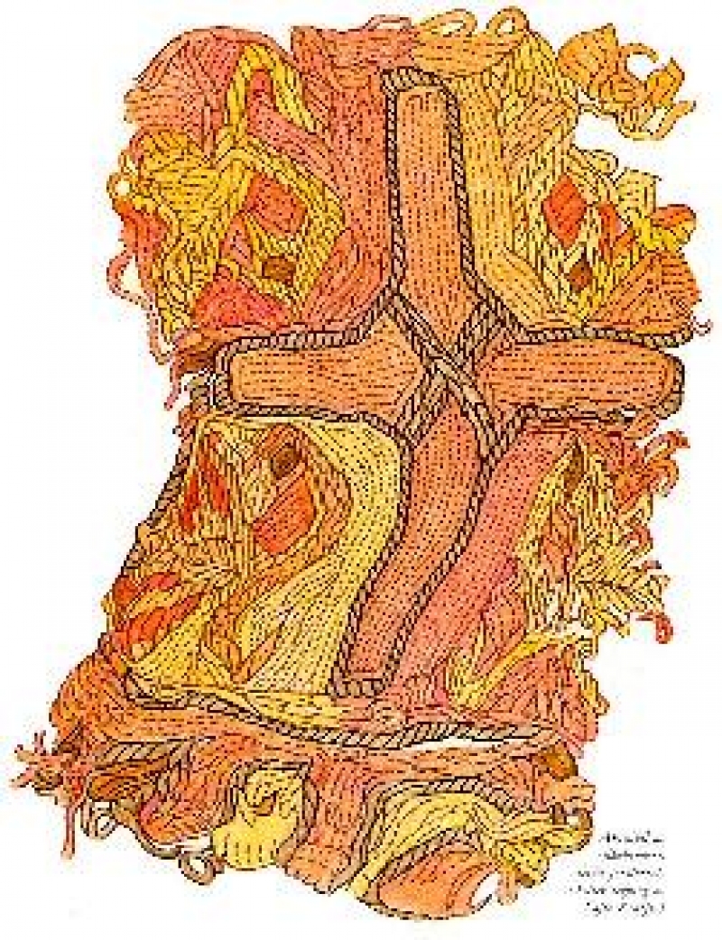 The textile fragments from Oseberg included woolen and silk fabrics, and remains of tapestries. There were several examples of silk appliqué and silk embroidery, which were worked using satin stitch, split stitch, stem stitch, and couching. See also a general entry on Viking embroideries.