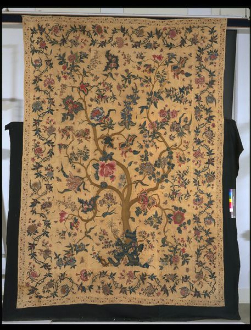 One such example is in the Victoria and Albert Museum, London (acc. no. S.29-1889). It is 256 x 224 cm in size. This palampore dates to the early eighteenth century and comes from Gujarat in western India. It has an off-white, cotton ground that is embroidered in chain stitch with multi-coloured silk thread.