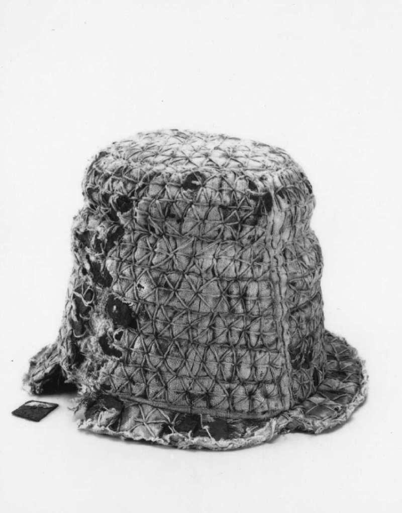 It consists of a series of small, square plates of iron, each with a hole in the middle. The plates were sewn in rows between two or more layers of thick linen cloth. The next step in making the helmet was to fix the iron plates in place, using a complex system of stitches to create a star-shaped pattern (a form of quilting).
