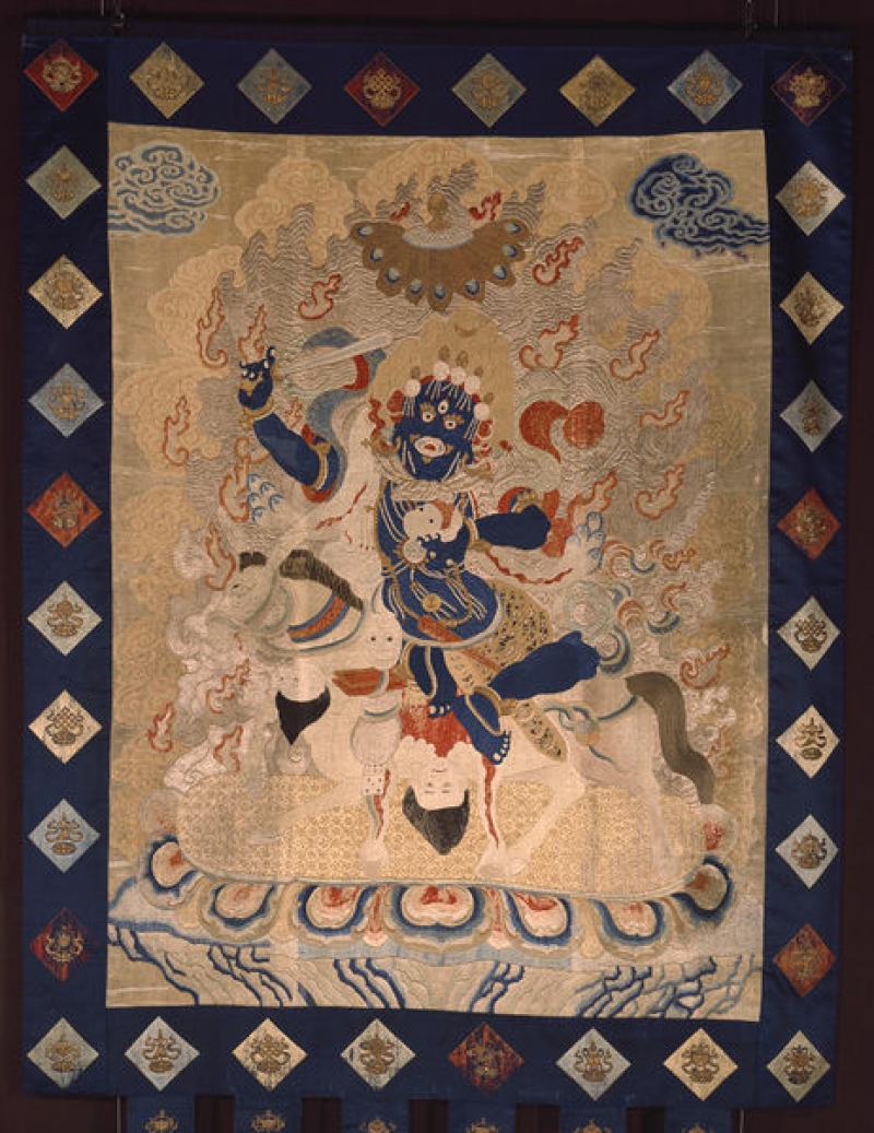 The collection of the Victoria and Albert Museum in London includes an embroidered thangka that probably derives from Inner Mongolia and dates to the period c. 1780-1850. The thangka has a silk ground material and embroidery worked with silk thread. There are some traces of painting.