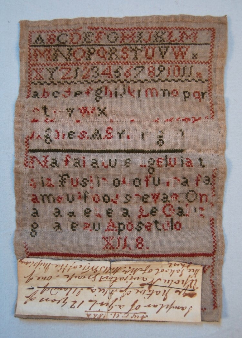 The long text at the bottom of the sampler is Biblical and is apparently written in a form of Samoan in Latin alphabet (Aposetolo = Apostles, Galuega = Acts), ending in the reference X.II.8. According to the Museum registration department it is a: "Sampler worked by the natives of Samoa (Navigator's Island)."