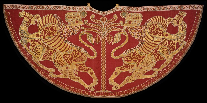 Along the lower edge of the mantle is a Kufic Arabic inscription (called tiraz), which reads in translation: