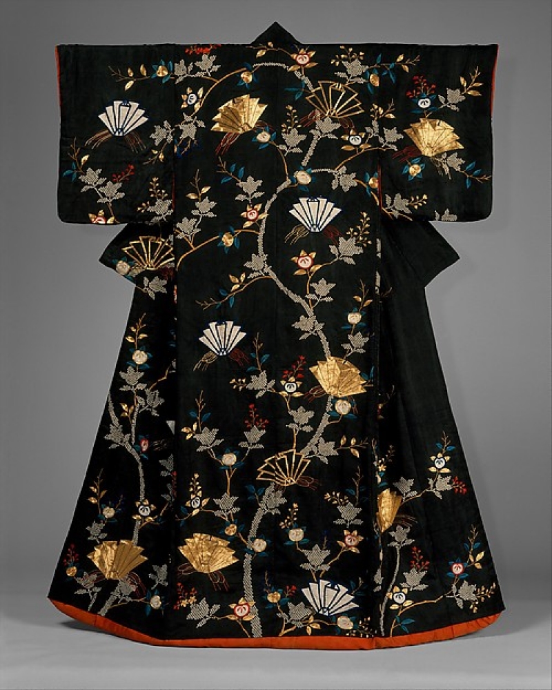 This outer robe is decorated with various motifs, including the evergreen mandarin tree (tachibana) executed in tie-dye (shibori) on a patterned black silk damask ground, furthermore ornamented with embroidery and gold thread couching.