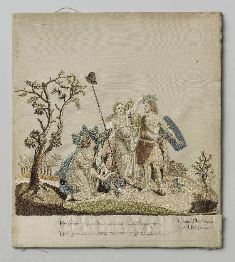 The embroidery was made by Louise van Ommeren, née Hengevelt, sometime around 1800. The picture shows a Batavian (Batavier in Dutch) clad in fur who is being honoured by a personification of Freedom. She holds a laurel wreath with her left hand, and a lance with a 'freedom hat' with her right hand. To the left is another figure, who is positioned kneeling next to a basket full of flowers and fruit, symbolising the cornucopia.