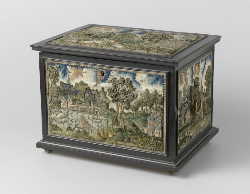 A casket with ebony veneer and decorated with embroidery on the lid and its four sides is housed in the Rijksmuseum Amsterdam. It dates to c. 1650 and was produced in England. It measures 25.5 (h) x 27.2 (w) x 35 (l) cm. The embroidery is carried out with gold and silver thread, and silk. The embroidery shows various landscapes.