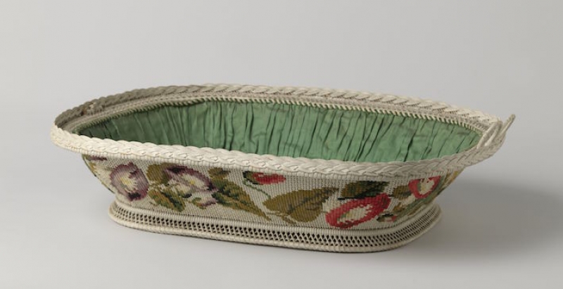 The Rijksmuseum Amsterdam holds a nappy basket that is decorated with Berlin wool work, worked in cross stitch. The white basket measures 12 x 51.5 x 37.5 cm.