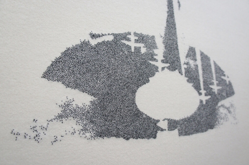 In particular, she uses the seed stitch for her work: “mainly .. because of the abstract graphical qualities of the marks made when used as a drawing tool, and also the appropriate visual links to my chosen subject matter.” (pers. comm. Roanna Wells). In particular she embroiders works with aerial images of mass gatherings linked to social, political and religious events to help give “time and meaning to the individuals depicted.”