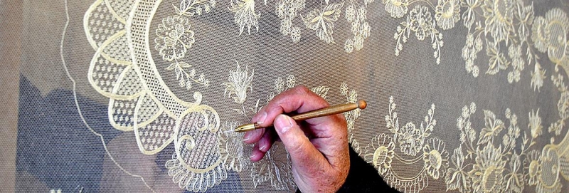 The tambour hook is used to make the outlines as well as the different fillings, with the aim of creating a stronger contrast between the open and worked areas of the lace.