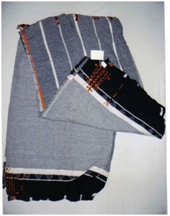The second type is traditionally worn by a married woman. It is a blue and white cotton covering (tarfutet) made of two lengths of cloth sewn together. The cloth used to be woven at Kerdasa near Cairo. The final garment measures about 250 x 175 cm. It is used to cover the wearer’s body from head to foot. A tarfutet is normally embroidered along the seam line in the form of an elaborate band (taksart). The covering has a small section of embroidered decoration (kushit) used to cover the upper half of the face. This panel usually has a protective hand motif or an eight-pointed star, and is worn against the wearer’s forehead. A similar panel is at the opposite side of the tarfutet, which is worn at the wearer's heels.