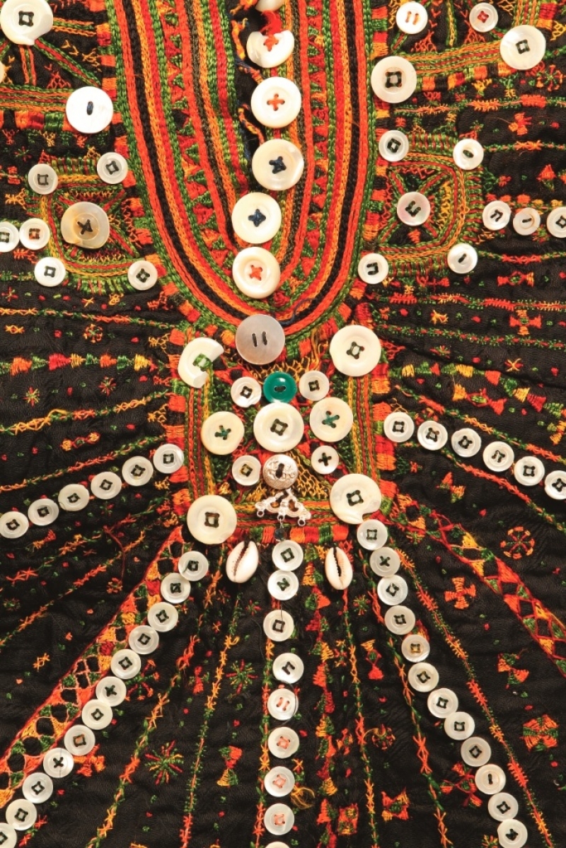 A feature of the Siwa oasis garments is the number of different ways in which the buttons are sewn onto the dresses. Most of the buttons have four holes, and at least eighteen different ways of sewing the buttons on garments have been identified. There does not appear to be a specific reason behind the use of these patterns, and it seems that the decorative effect is sufficient. In addition, a wider variety of effects is created by using differently coloured sewing threads and the addition of small, coloured sequins in the centre of the buttons. The use of buttons in this manner appears to be unique to the Siwa oasis, and it is not clear when or where this idea was developed.