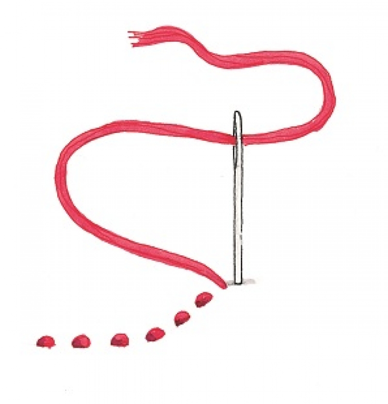 The stab stitch is often used in couching or laid work. The thread goes up, over the thread to be held in place, and then down through the same hole. The thread then passes along the reverse side of the ground material to the position of the next stitch.