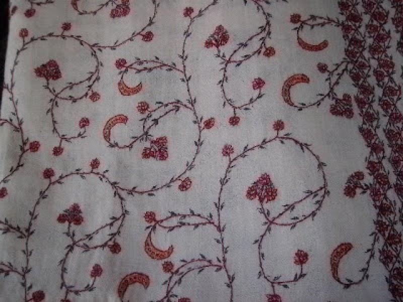 This type of embroidery is used for the broad panels on shawls, as well as in more expensive forms for the complete shawl or stole. The Indian term peppier mache derives from the French term papier-mâché, which means 'chewed paper.' It is a composite material made of strips or pieces of paper that have been glued together in some manner. It was used to make trays, candle sticks, ornaments, and so forth. This technique was very popular in the nineteenth century and often included prints of flowers, people, and so forth.