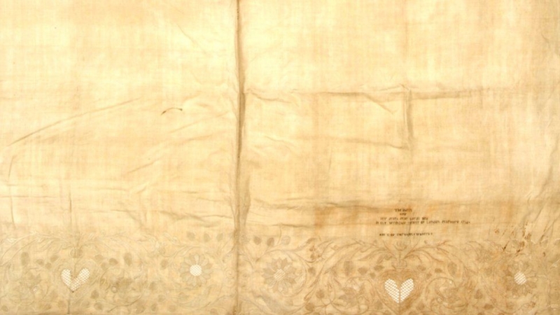 The bedsheet was embroidered by Anna Maria Radclyffe (1693-1723) to commemorate her husband, James, who was beheaded for treason in 1716. James was the third Earl of Derwentwater and a grandson of Charles II. He was executed aged 26 for his involvement in the first Jacobite insurrection. His story features in Sir Walter Scott's novel, Rob Roy.