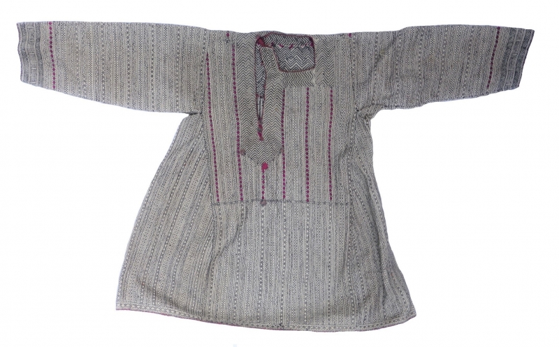 The shirt is made of two layers of a thick cotton material, which are quilted together with lines of cross stitch, running stitch, two-sided line stitch and paired running stitch. The stitches are worked over four warp and four weft threads in various orders. The material is made with paired weft threads and single warp threads, which, when stitched, causes a rippled effect.