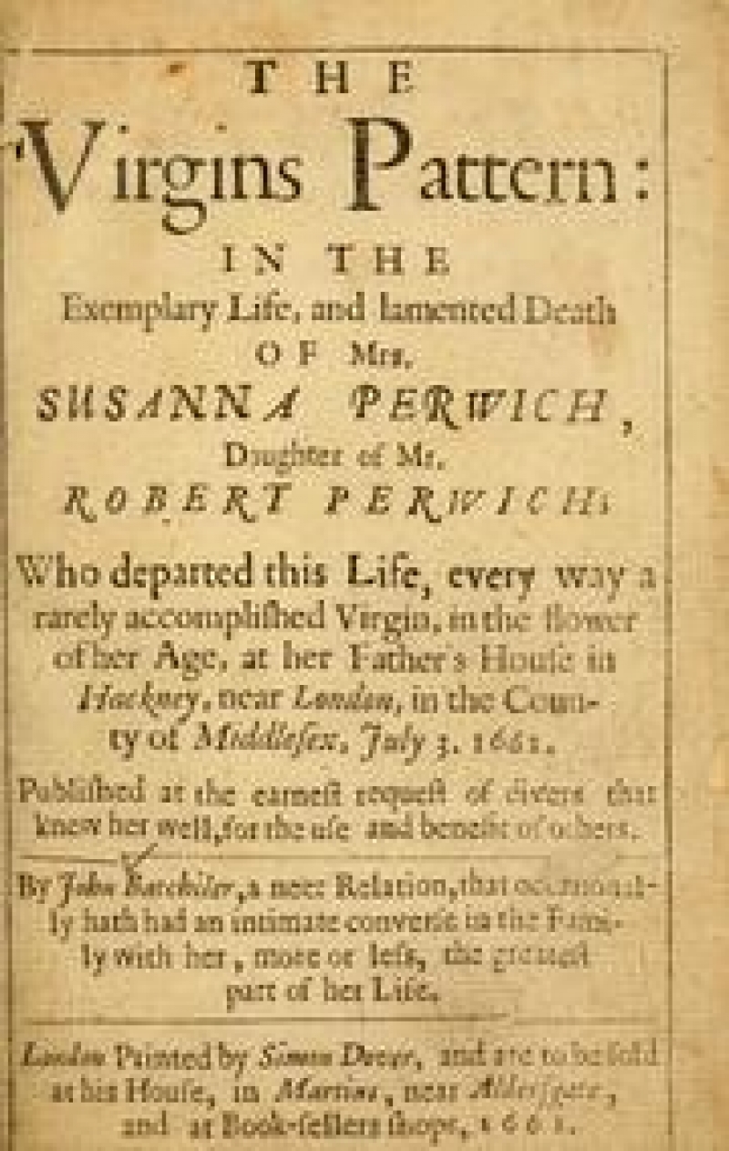 It appears that she was regarded by some members of her family as a paragon of female virtues and skills. A pamphlet and poem were written about her by John Batchiler (c. 1615-1674; not Bathchiler or Bachelar as is sometimes written), who described himself as a “neer Relative that occasionally hath had an intimate converse in the family with her, more or less, the greatest part of her life.” It is likely that he was Susanna Perwich’s brother-in-law.