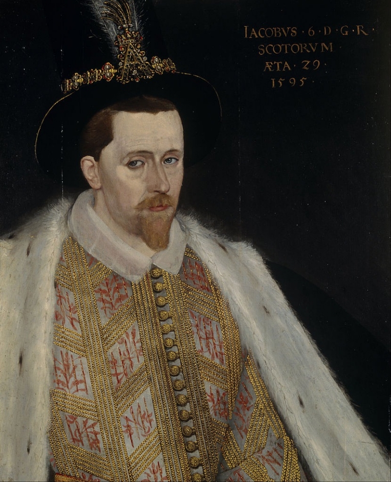 The ‘A’ form of the aigrette refers to his wife, Anne of Denmark, whom he married in 1589. The pale grey (or blue) doublet is decorated with applied lengths of cord made from plaiting three, thick gold coloured wires together. The cords have been sewn down to the ground material in a trellis work pattern using five strands of cords for each 'band'. Inside the parallelograms of the trellis work there are strands of deep pink (probably floss silk) that are wrapped around (or possibly couched down) by what appears to be a flat, gold thread (also known as plate).