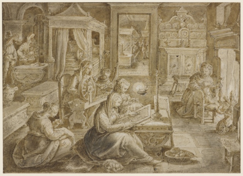 The women are seated in an elaborately ornamented room. The women are working embroidery, spinning threads, working needle point and bobbin lace. The woman at the spinning wheel may be Cornelia, the daughter of Scipio Africanus and the wife of Tiberius Sempronius Gracchus.
