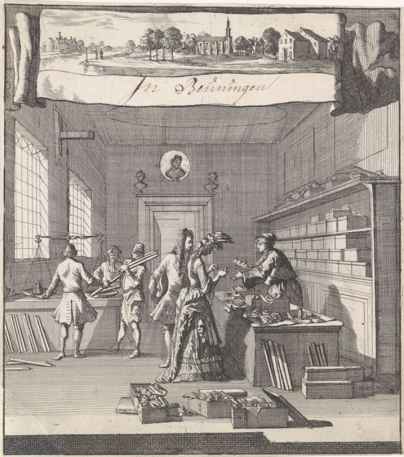The print shows the inside of the shop, with a man and woman to the right sorting out some threads. To the left the shop assistants are weighing the spools of threads.