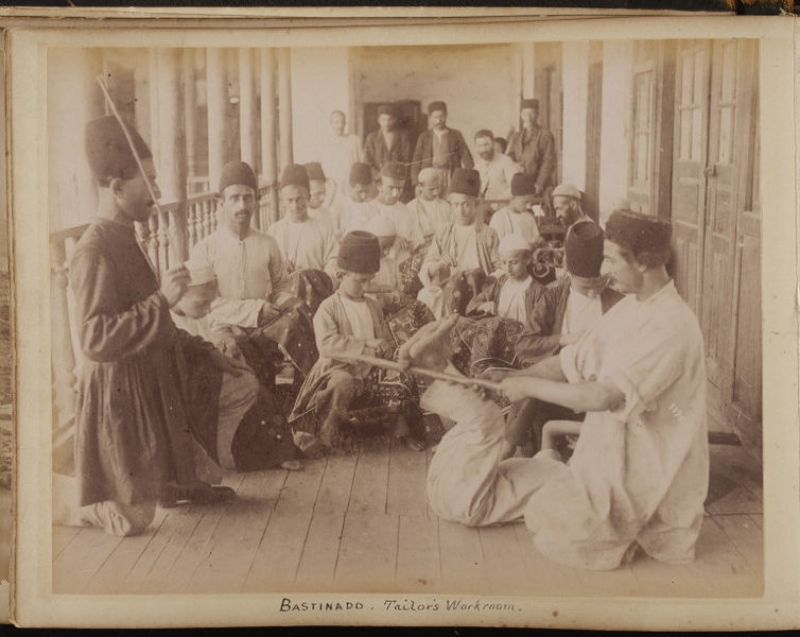 A photograph by Antoin Sevruguin (1835-1933) shows corporal punishment being carried out in an embroidery workshop in Iran. The photograph was taken around 1880.